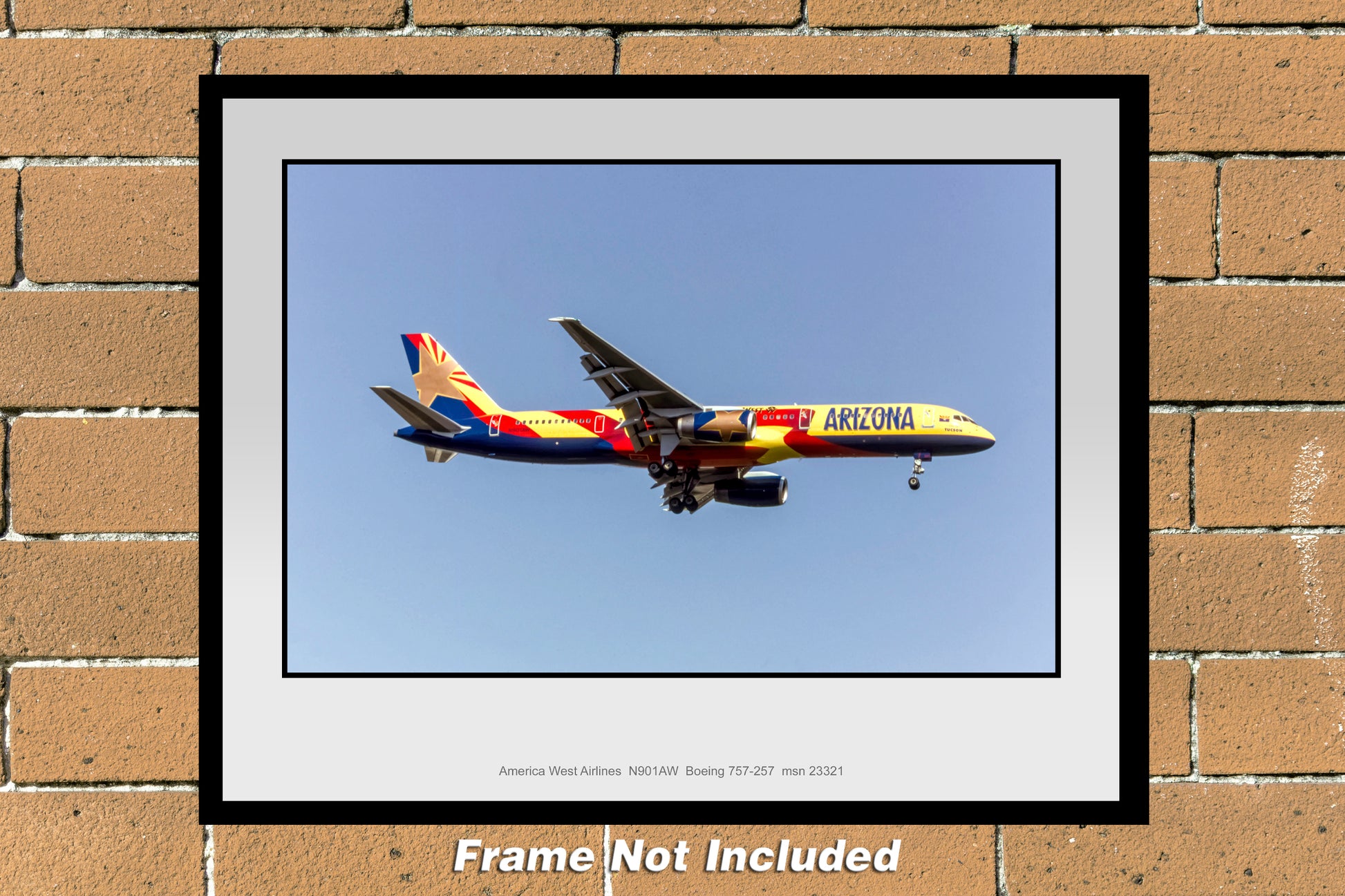 This stunning 11" x 14" color photograph captures the beauty of the America West Airlines Boeing 757-257 in all its glory. The photograph is a must-have for aviation enthusiasts and collectors alike. Perfectly showcasing the aircraft's sleek design and impressive size, this photograph is a true work of art. Featuring the iconic America West Arizona Flag livery, this photograph is a great addition to any collection focused on airlines or transportation. Made in the United States, this high-quality photograph is sure to impress. Add it to your collection today and enjoy a piece of aviation history.