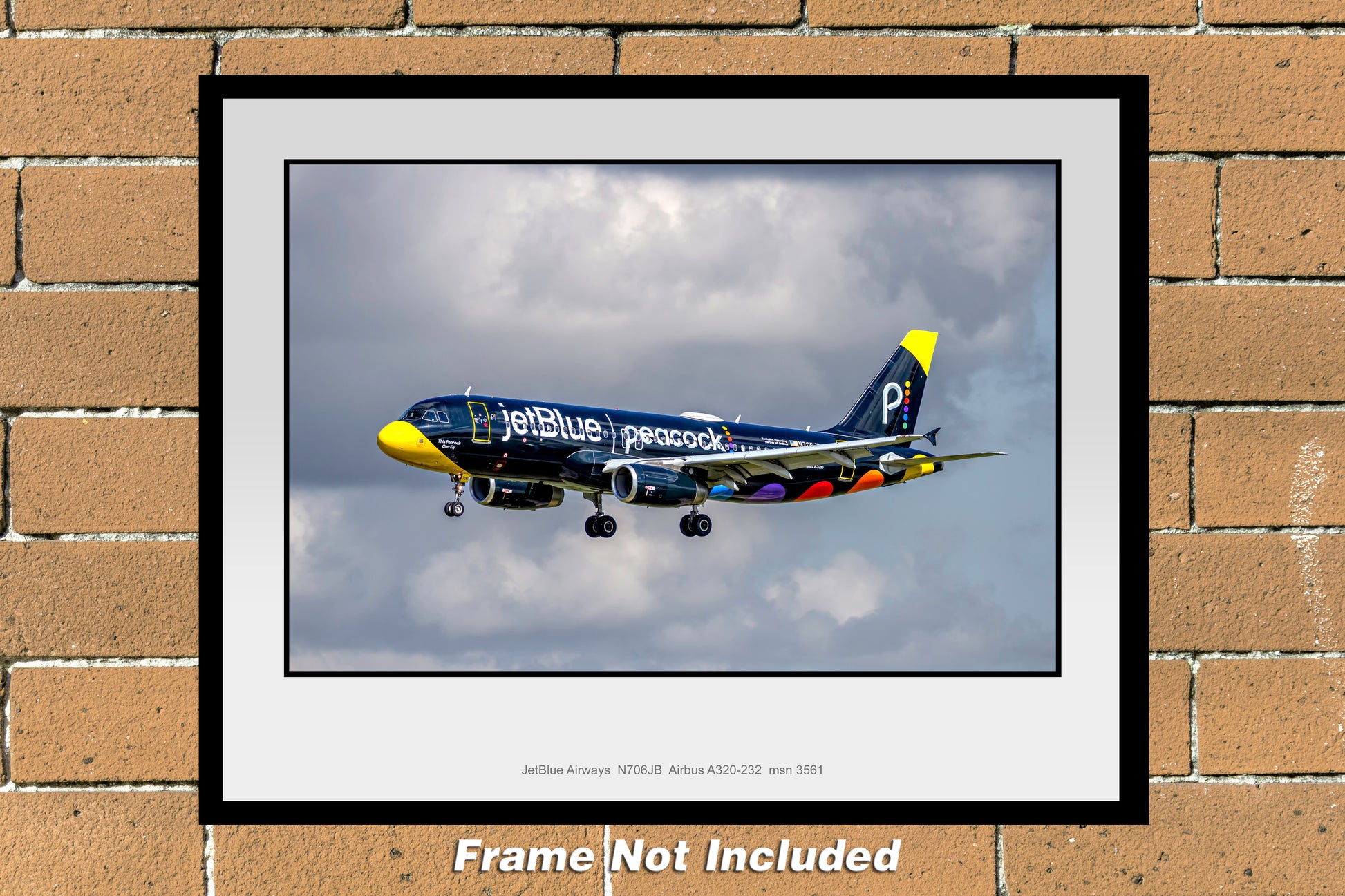 This color photograph features a JetBlue Airways, N506JB, Airbus A320 aircraft, measuring 11" x 14". The photograph was manufactured in the United States and is a great addition to any aviation or transportation collectibles. It depicts the aircraft in a unique and interesting manner, making it a must-have for photograph enthusiasts and collectors alike.
